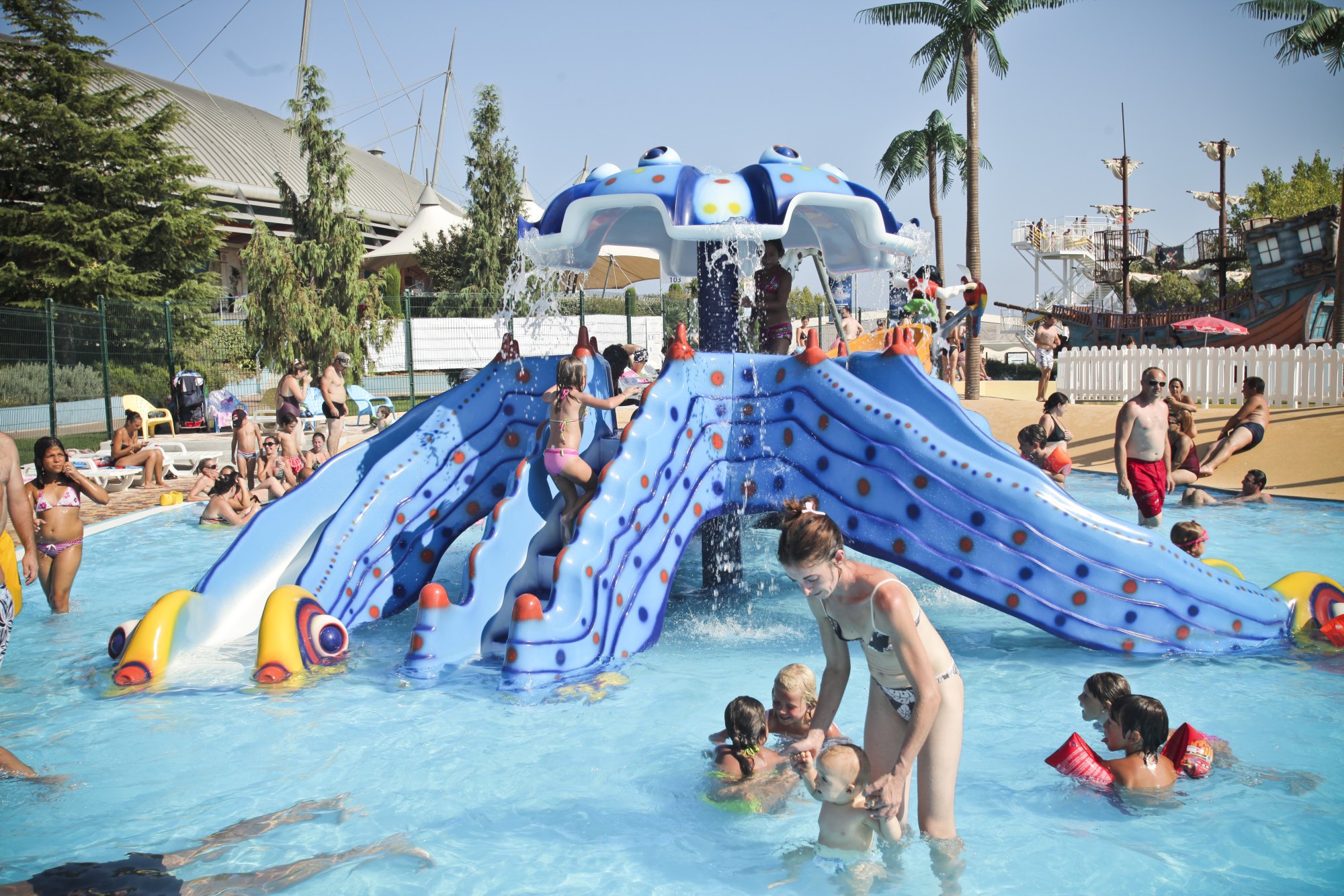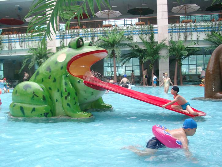 水上乐园设备:家庭小冲天回旋滑梯、家庭组合滑梯、八爪鱼滑梯、海盗船、儿童水屋水寨、蛇形滑梯、青蛙滑梯、雨蘑菇、喷水袋鼠,戏水池的面积近1300平方米。
