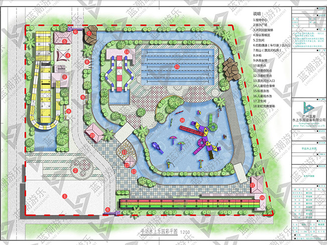 在设计上水上乐园采用了“以水为魂”的设计理念,整个水上乐园的建设都是围绕“水”来做文章,以保证所有的水上游乐设备更好地融入到景区,设计中浓浓地客家风情更让整个园区显得多姿多彩。作为项目的一期工程,将建成超级大喇叭、螺旋滑梯、造浪池、四彩滑梯、儿童组合滑梯等多项水上娱乐设备。项目建成后将成为平远市乃至广东最具民族特色的水上乐园。