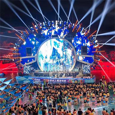 夜場(chǎng)的核心元素是表演,而表演的核心區(qū)域一般是水樂園的人工造浪池中。當(dāng)夜場(chǎng)表演開始時(shí),幾乎所有的游客都聚集在人工造浪池區(qū)域,一邊享受海浪的律動(dòng),一邊欣賞舞臺(tái)上的節(jié)目?jī)?nèi)容。在主持人的帶動(dòng)下,觀眾放聲尖叫盡情釋放。近年來,水樂園夜場(chǎng)的演出內(nèi)容越來越精彩刺激,從熱情奔放的外國(guó)歌舞表演,到明星、網(wǎng)紅助陣,現(xiàn)場(chǎng)樂隊(duì)電音晚會(huì),火舞表演,水秀,虛擬仿真投影等,種類繁多,不斷沖擊著游客的感官神經(jīng)。